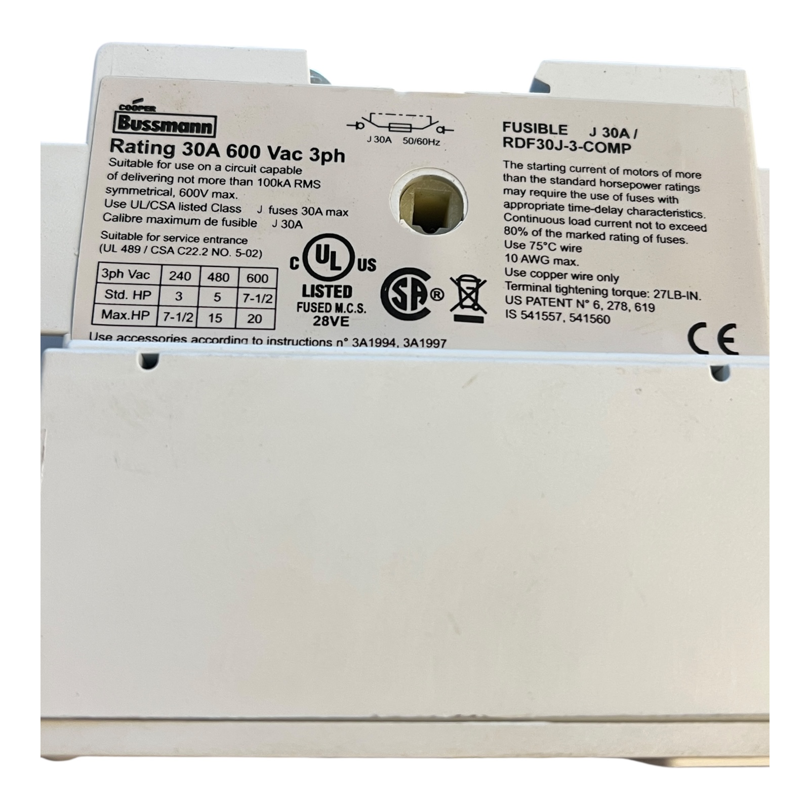 Rating 30A 600 Vac 3ph