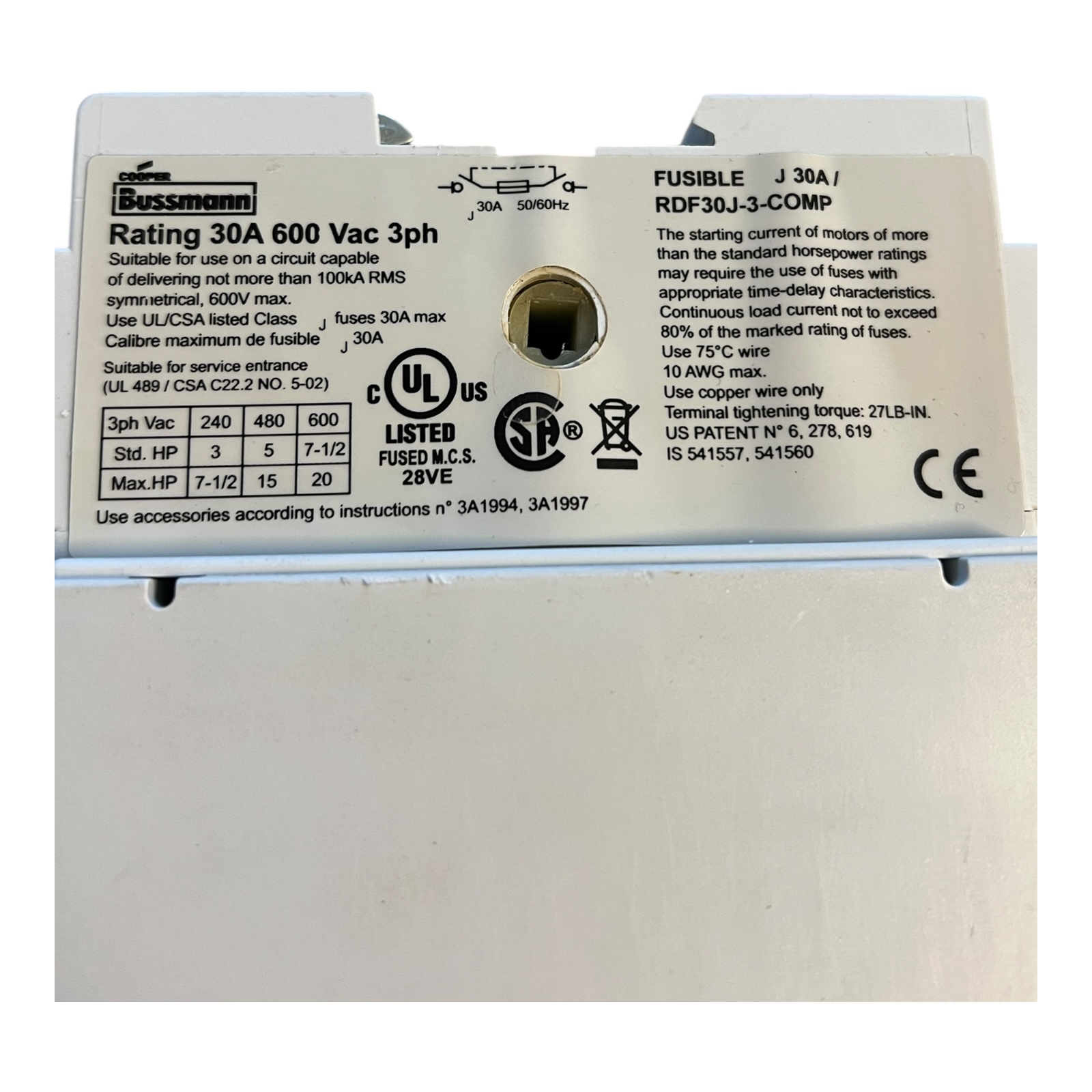Rating 30A 600 Vac 3ph