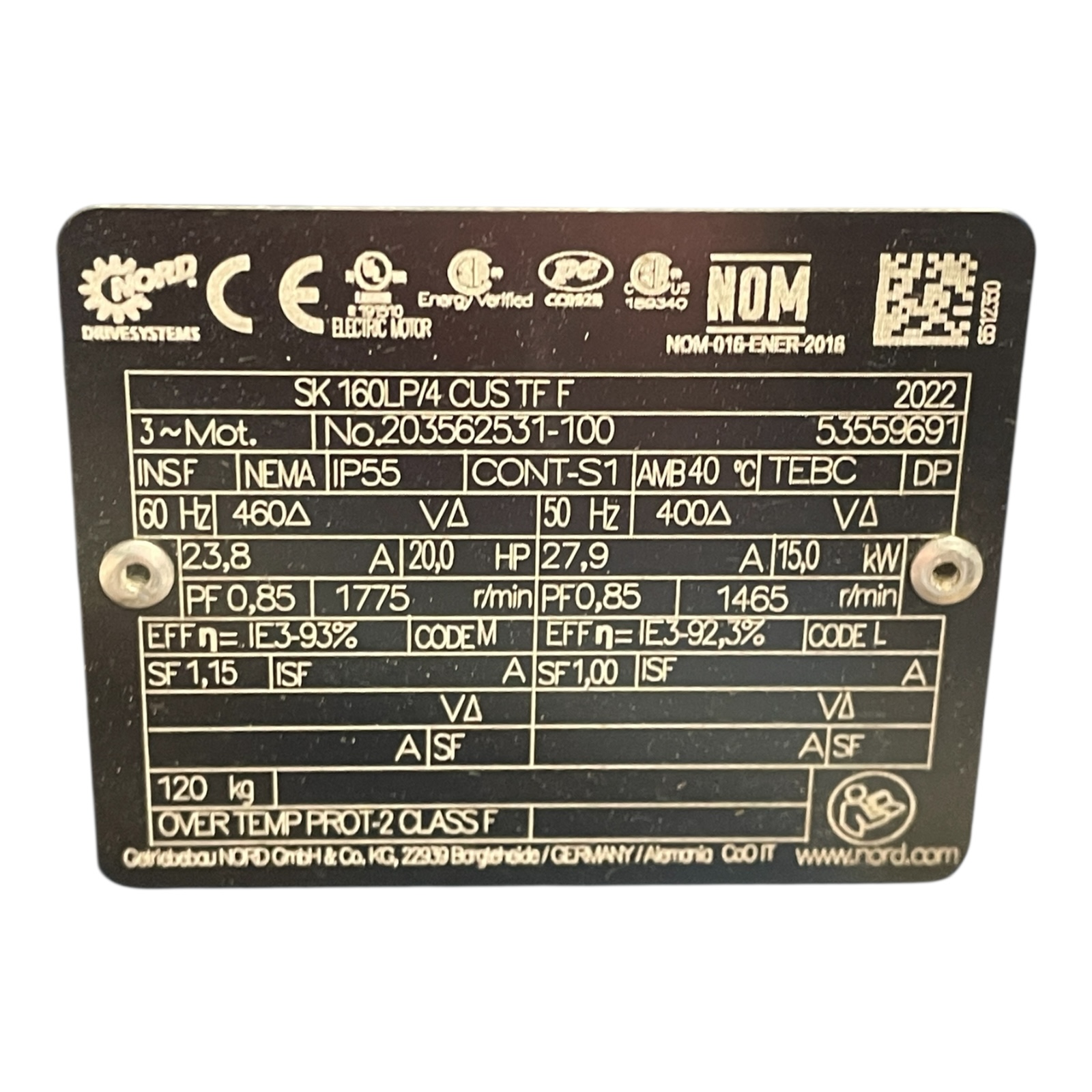 60Hz, 460V, 23,8A, 20,0 HP, PF 0,85, 1775 r/min