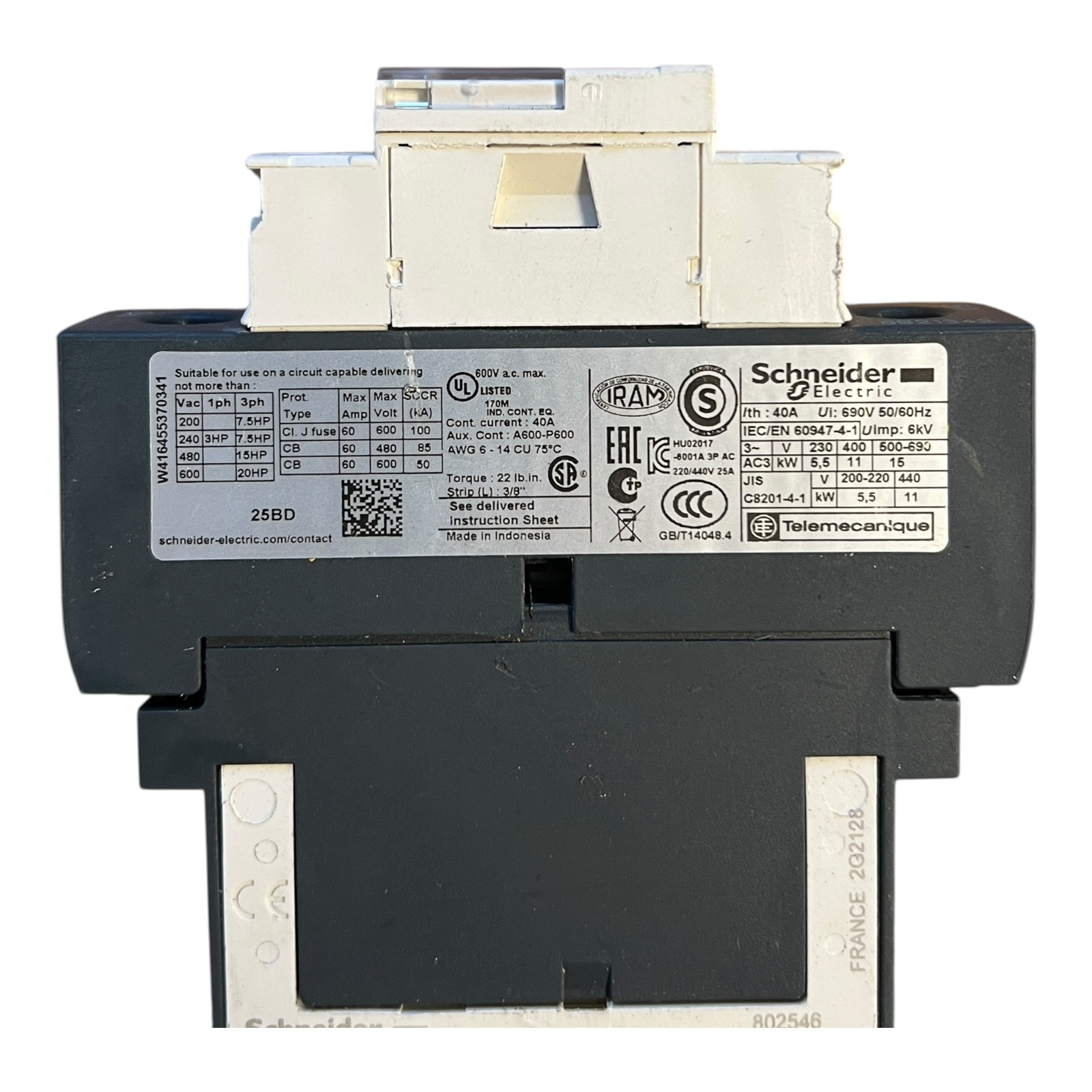Schneider Electric LC1D25BD + LAD4TBDL Contactor -used-